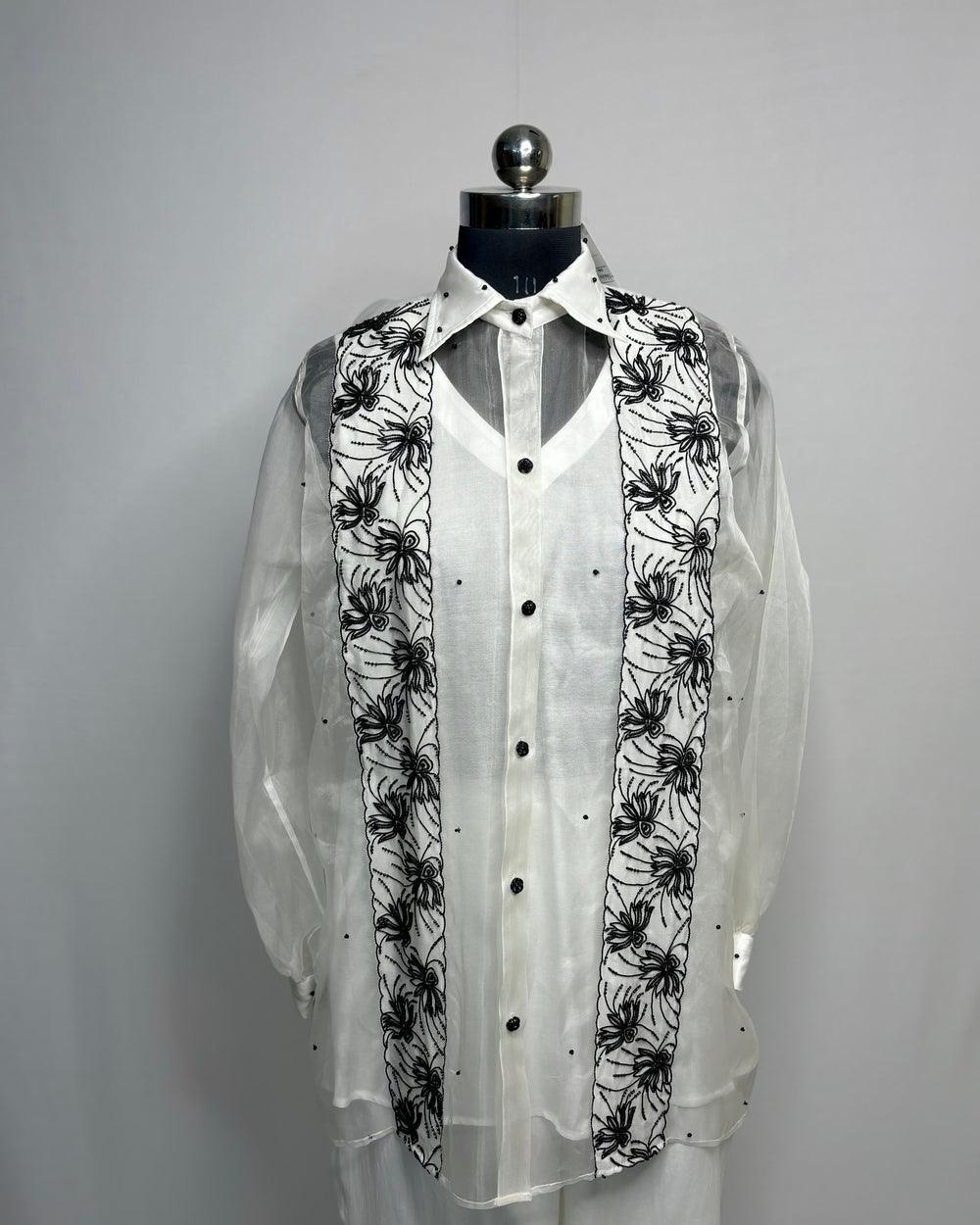 Elevate your style with this premium designer co-ord set featuring a white organza hand-embroidered shirt paired with high-waist crepe bell-bottom pants. Perfect party wear, festive wear, and elegant evening fashion, this outfit blends modern glamour with handcrafted luxury—ideal for boutique styling and premium occasions.